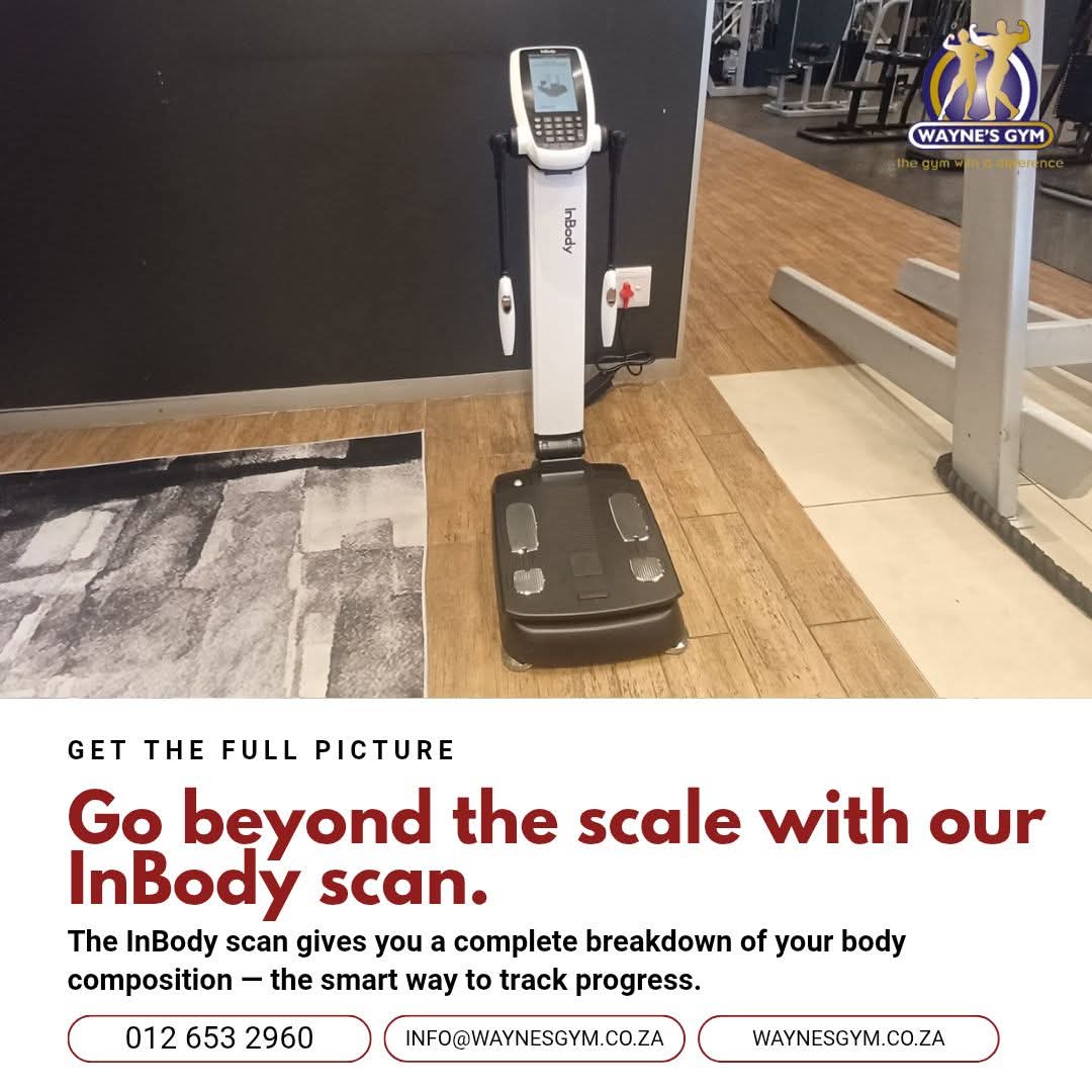 Get a deep dive into your body composition with our state-of-the-art InBody Scanner at Waynes Gym! Track your progress and unlock your full potential. Our friendly staff and personal trainers are here to assist you in using the scanner and interpreting your results. As a member, you'll enjoy your first InBody free and then pay a minimal fee of R100 for a scan thereafter. Non-members can get scanned for just R200. Book your session today and start seeing real results! Phone us now to schedule your scan and take the first step towards achieving your fitness goals!